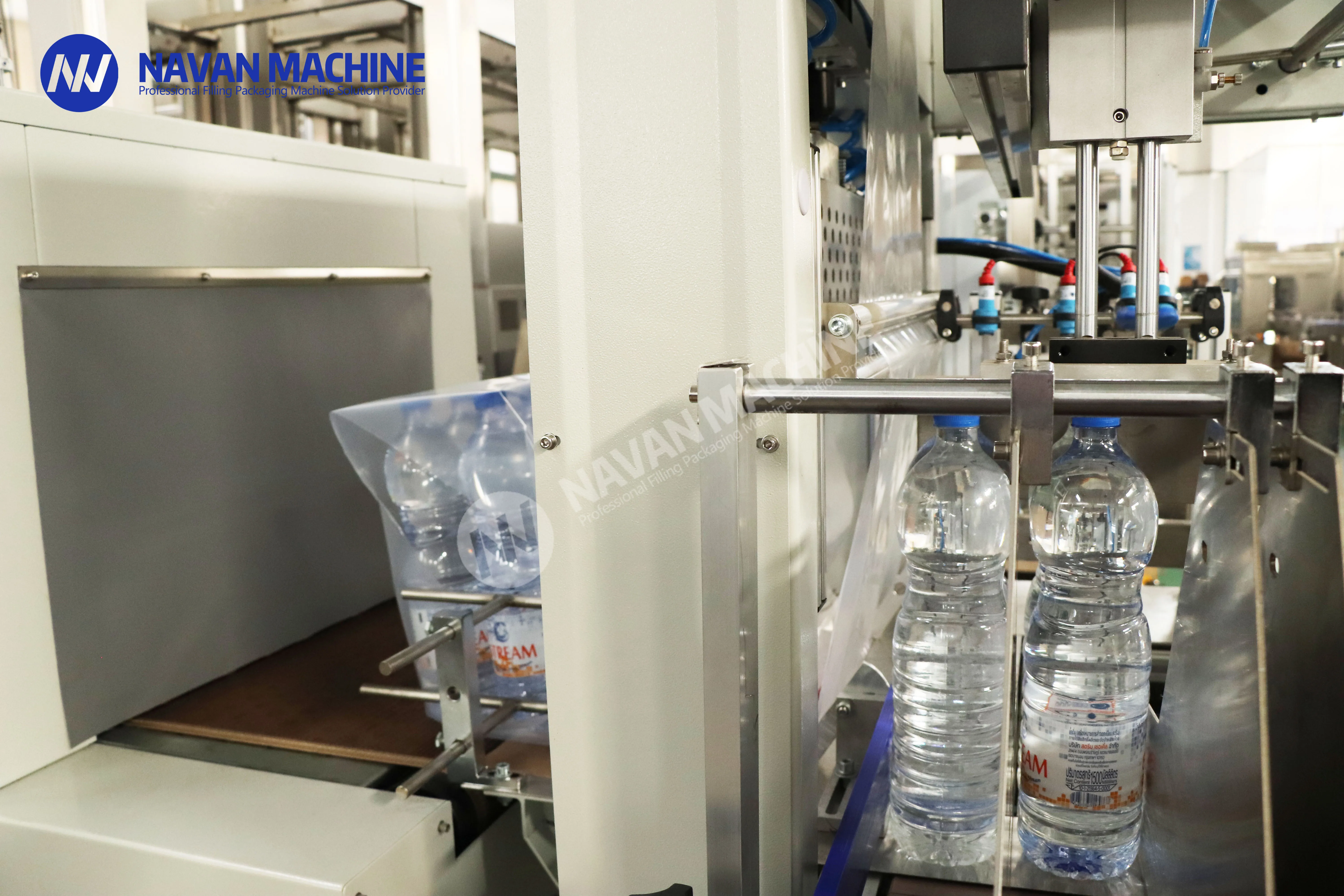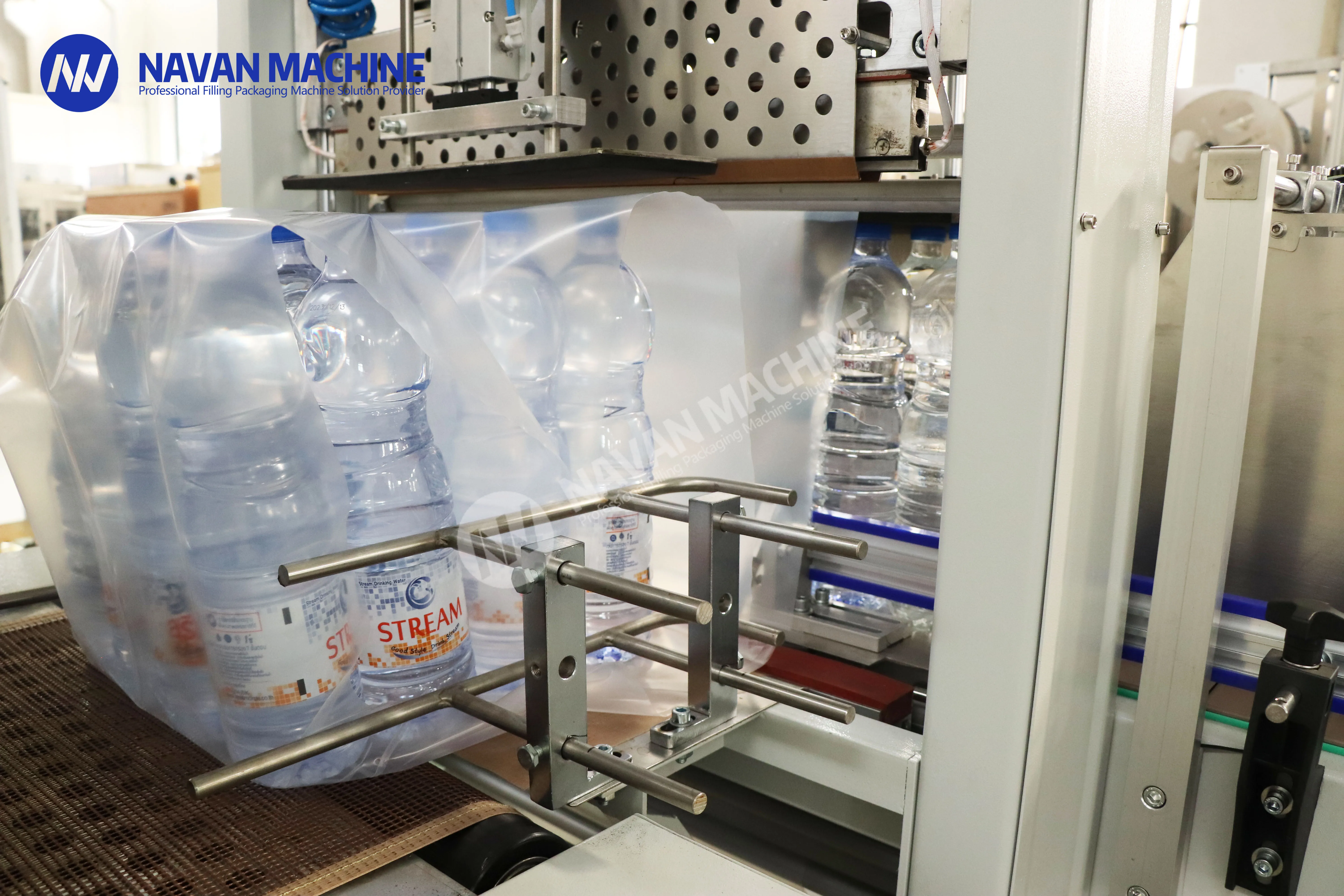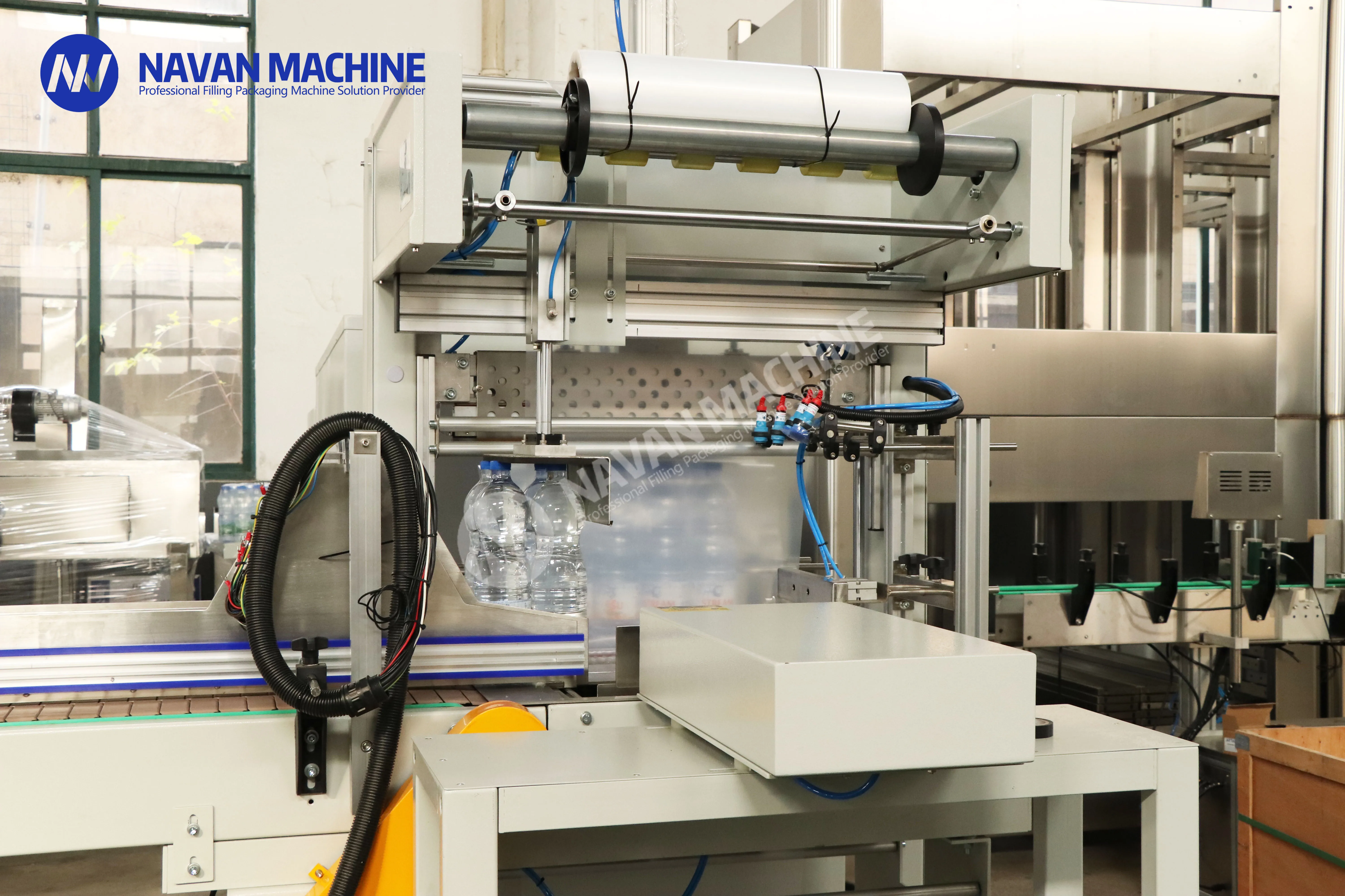 This automatic heat shrink film wrapping machine is expertly designed for efficient packaging of plastic bottles containing water, juice, and carbonated beverages. Utilizing high-quality PE film, it delivers precise and secure wrapping results while maintaining high production speeds. The machine features advanced temperature control and smooth conveyor operation, ensuring consistent shrinkage and professional finish on every package. Perfect for beverage manufacturers and bottling facilities, this versatile system can handle various bottle sizes and shapes, making product changeovers quick and simple. With its user-friendly interface and reliable performance, this wrapping machine significantly improves packaging efficiency while reducing labor costs. The robust construction and quality components ensure long-term durability, making it an ideal choice for both small-scale operations and large production facilities looking to streamline their packaging process.